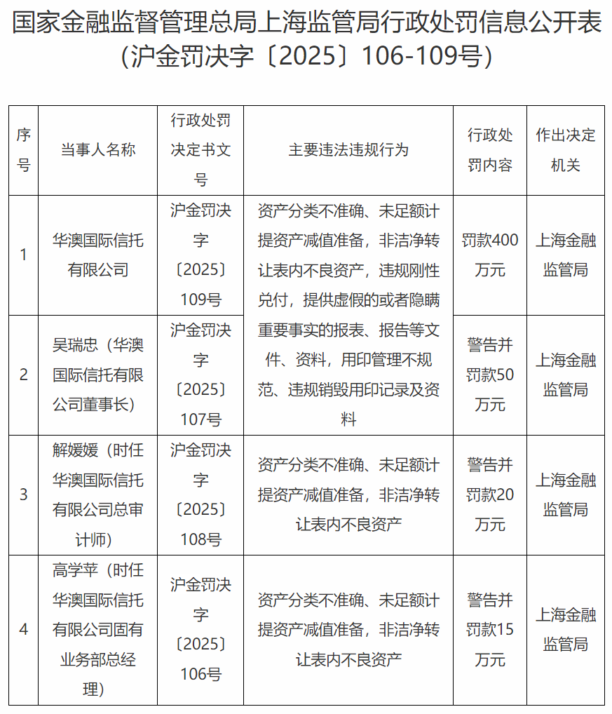 此外,因资产分类不准确、未足额计提资产减值准备,非洁净转让表内不良资产,时任华澳国际信托有限公司总审计师解媛媛,被上海金融监管局警告并罚款20万元;时任华澳国际信托有限公司固有业务部总经理高学苹,被上海金融监管局警告并罚款15万元。