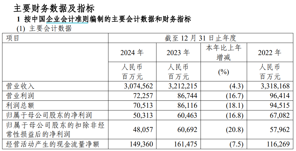 【大河财立方消息】3月23日,中国石化发布2024年年报。公司2024年实现营业收入3.07万亿元,同比下降4.3%;归属于母公司股东的净利润503.1亿元,同比下降16.8%。
