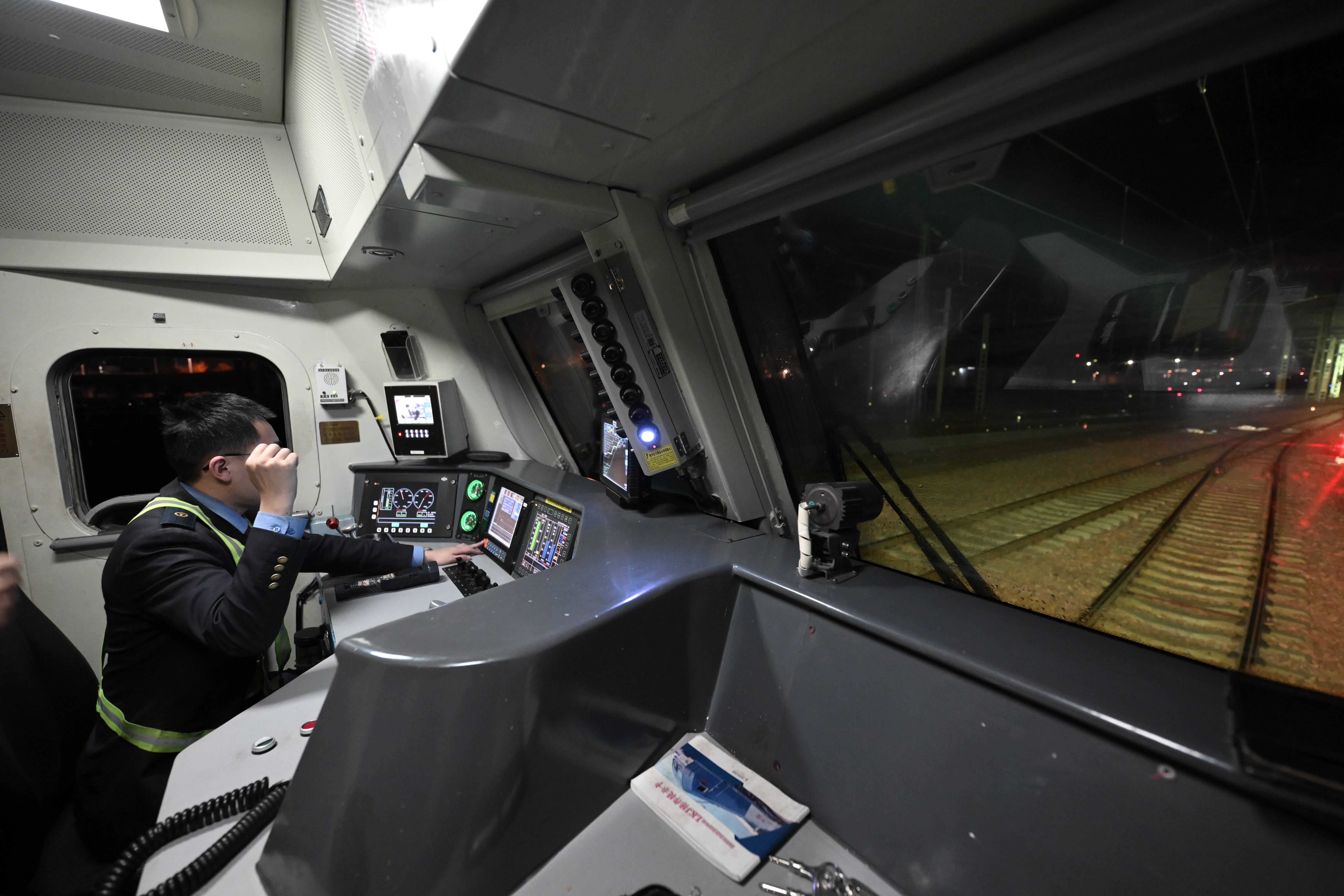 透过驾驶室电子地图,可以看到列车以80公里/小时的速度持续东进。对讲机里,不时传来待避停车指令,李飞娴熟制动,不一会儿,窗外就闪过客运列车流星般的光轨。