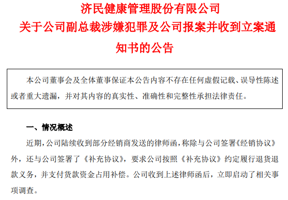 【大河财立方消息】3月26日,济民健康管理股份有限公司(证券简称:济民健康)发布公告称,公司副总裁何清红涉嫌犯罪,公司取得初步证据后,向台州市公安局黄岩分局报案,今日收到警方立案通知书。