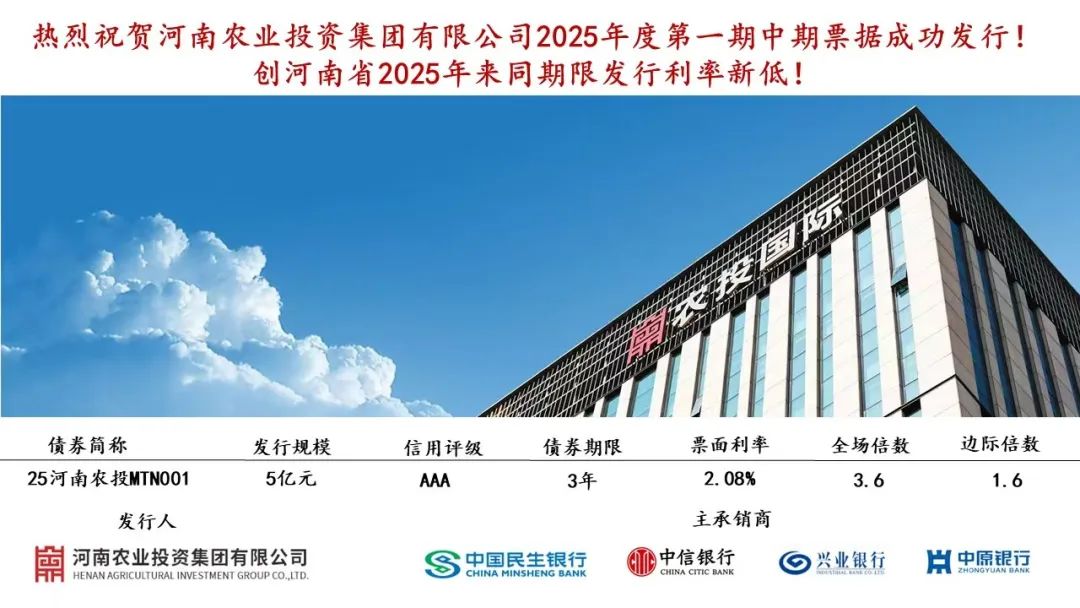【大河财立方消息】3月25日,河南农投集团在银行间债券市场成功发行2025年度第一期中期票据。本次发行规模5亿元,债券期限3年,票面利率2.08%,创河南省2025年来同期限债券利率新低。据悉,本期发行债券是河南农投集团首次在资本市场公开亮相。