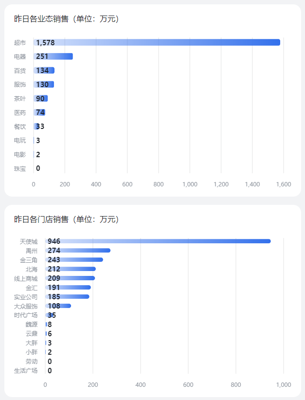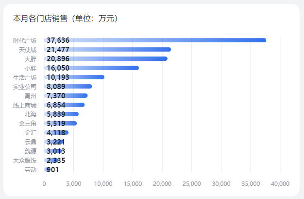 本月过亿的业态有超市78740万元、电器16329万元、百货14513万元、珠宝14489万元。其中时代广场店销售额最高,达37636万元,天使城店和大胖店紧随其后,势均力敌,销售额均刚超2亿元。