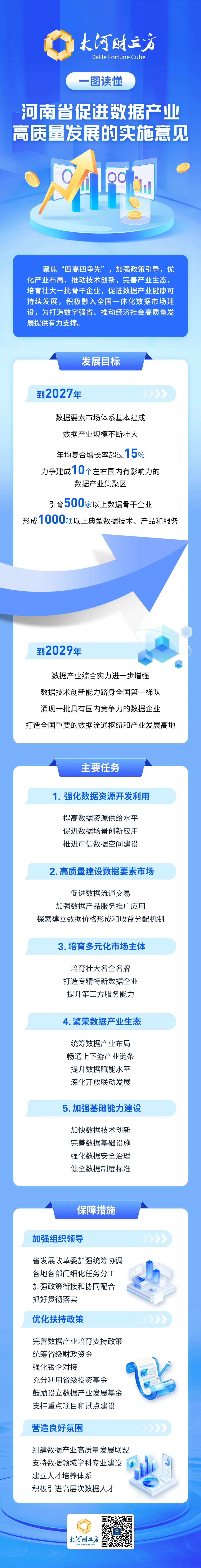 【大河财立方 记者 李铮 见习记者 李雯雯】为抢抓发展机遇,积极融入全国一体化数据市场建设,将我省规模市场优势、海量数据优势转化为产业优势,提高我省数据产业的竞争力,加快培育新质生产力,近日,河南省政府办公厅印发了《河南省促进数据产业高质量发展的实施意见》(以下简称《实施意见》)。
