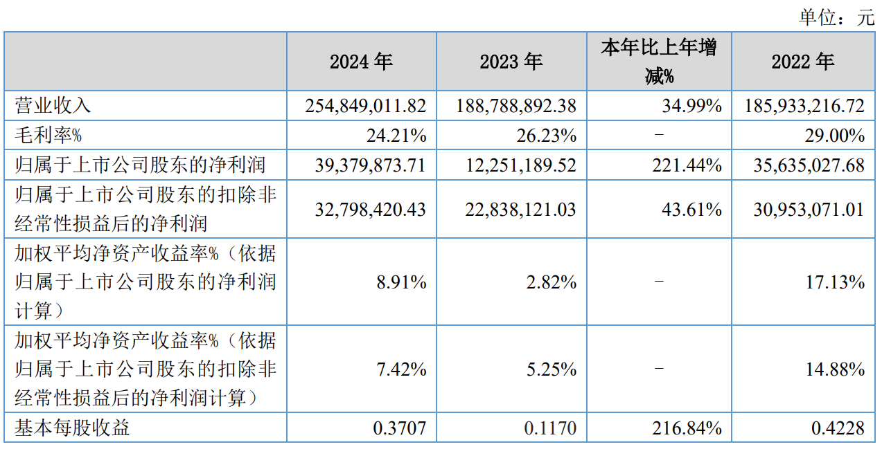 【大河财立方消息】3月28日晚间,天马新材披露2024年业绩。全年,实现营业收入2.55亿元,同比增长34.99%;归母净利润3937.99万元,同比增长221.44%。2024年末,公司总资产5.75亿元,较上年同期增长10.86%。
