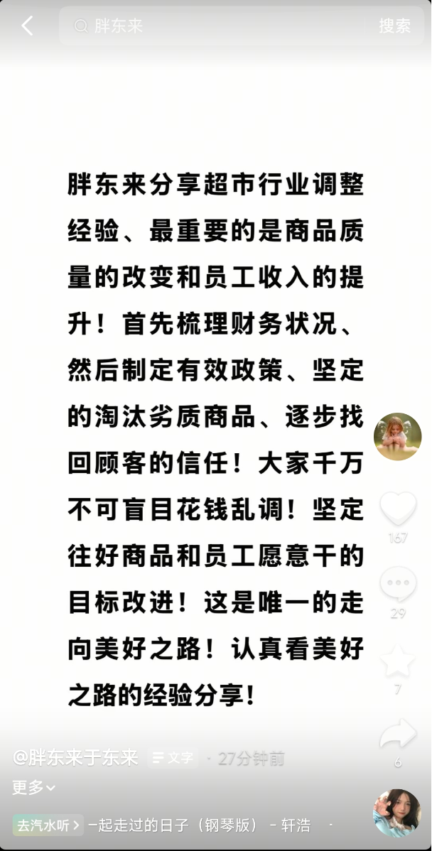 【大河财立方消息】3月30日,于东来发文称,胖东来分享超市行业调整经验,最重要的是商品质量的改变和员工收入的提升。首先梳理财务状况,然后制定有效政策、坚定地淘汰劣质商品、逐步找回顾客的信任。