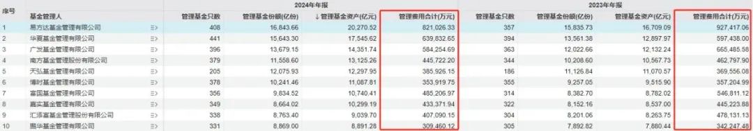 Wind数据显示,2024年全年管理基金资产最多的10家基金管理人,其管理的基金只数、份额均比2023年同期有所上升,但其中8家基金管理人在2024年的管理费用都低于2023年同期,仅有华夏基金和天弘基金的管理费用有所上升。