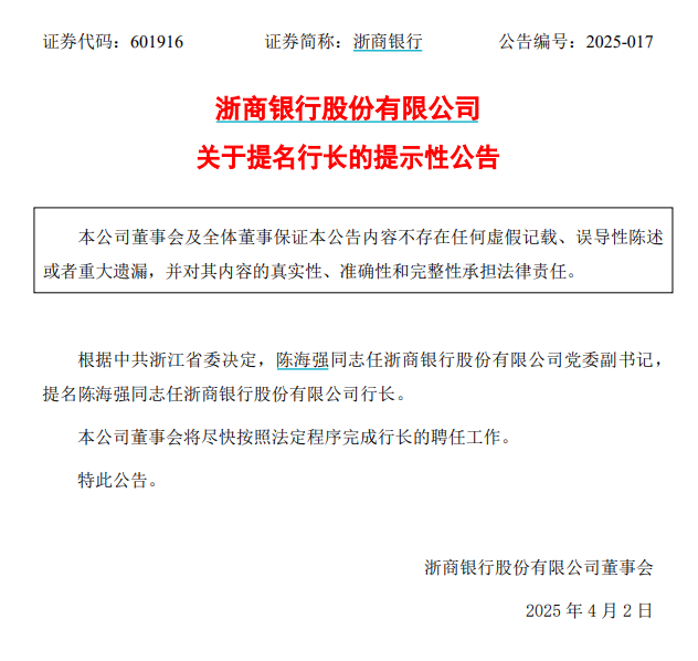 【大河财立方消息】4月2日,浙商银行公告,根据中共浙江省委决定,陈海强同志任浙商银行股份有限公司党委副书记,提名陈海强同志任浙商银行股份有限公司行长。浙商银行称,公司董事会将尽快按照法定程序完成行长的聘任工作。