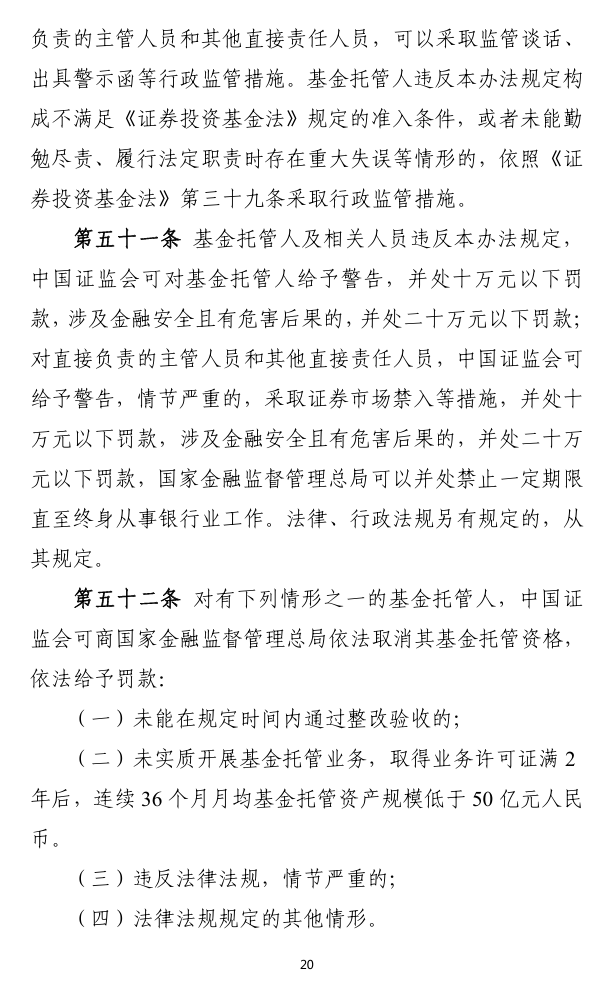完善取消资格的情形。在《办法》第52条规定的可以取消基金托管资格情形中,增加“未实质开展基金托管业务,取得业务许可证满2年后,连续36个月月均基金托管资产规模低于50亿元人民币”的情形。