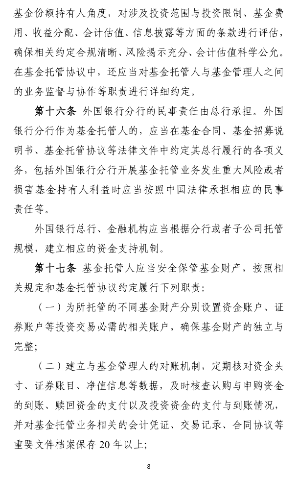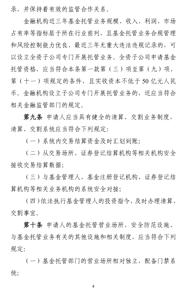 强化母公司职责。考虑到对子公司申请基金托管资格的实收资本要求适当降低,明确金融机构应当根据子公司托管规模,建立相应的资金支持机制(第16条);托管子公司承担市场结算参与人职责的,金融机构应当为其提供支持,协助子公司落实交收责任,避免子公司发生交收违约(第18条)。