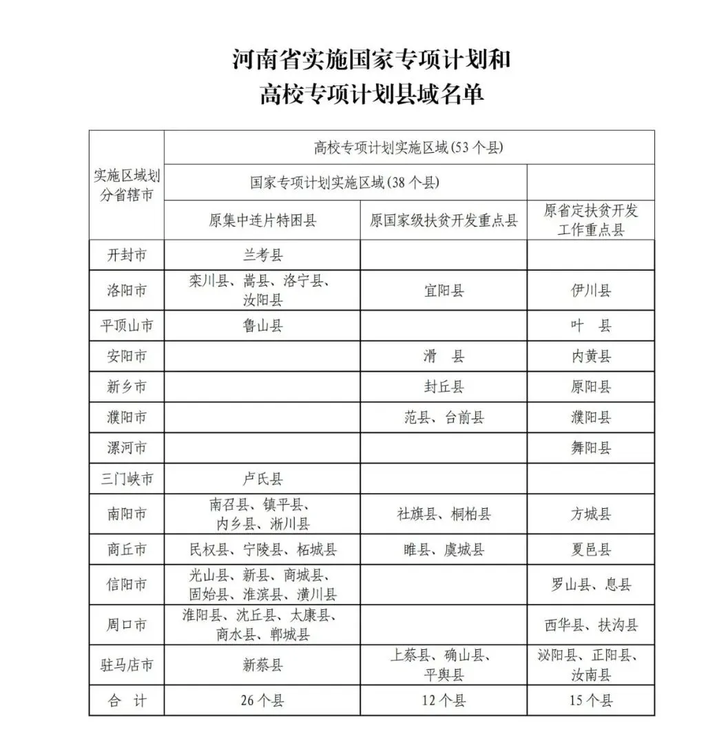 国家专项计划的实施区域为国家划定的38个县(包括26个原集中连片特殊困难县和12个原国家级扶贫开发重点县)。