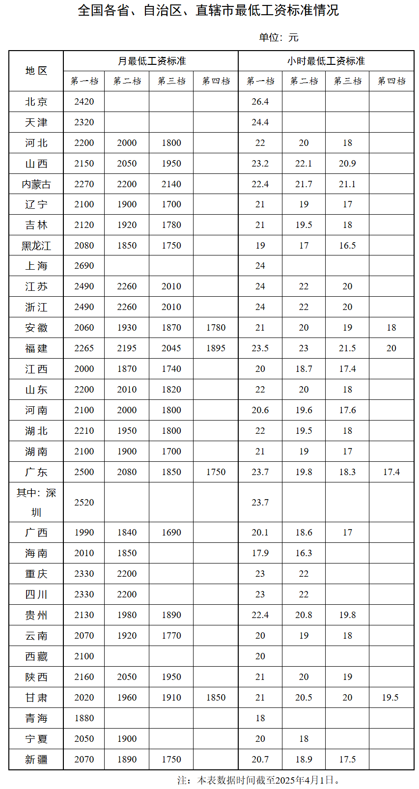 【大河财立方消息】4月7日消息,人社部近日公布了全国各省、自治区、直辖市最低工资标准情况(截至2025年4月1日)。
