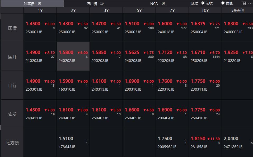 【大河财立方 记者 杨萨】4月7日,银行间主要利率债收益率大幅下行,10年期国债收益率一度下行超10个基点。截至发稿,10年期国债活跃券250004收益率下行7.75bp,至1.6375%;30Y特别国债2400006下行8.50bp至1.8300%。