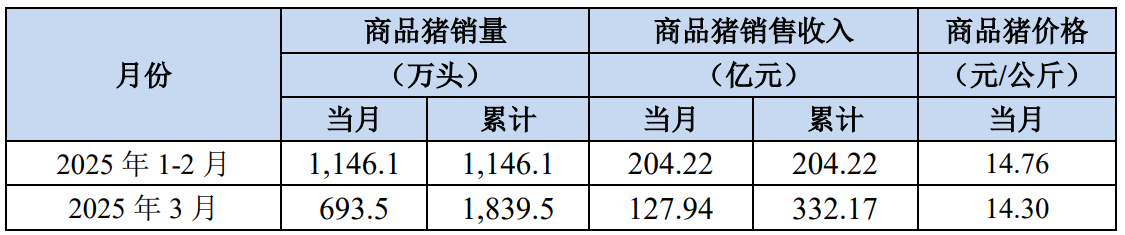 1-3月,牧原股份共销售商品猪1839.5万头,仔猪414.9万头,种猪11.3万头。截至2025年3月末,牧原股份能繁母猪存栏为348.5万头。