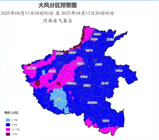 受较强冷空气影响,预计4月11日8时到13日20时,全省自西北向东南先后转西北或偏北风5到6级,阵风8到9级,其中安阳西部、鹤壁西部、新乡西部、焦作、济源、三门峡、洛阳中南部、郑州西部、许昌西部、平顶山西部、南阳北部、信阳南部部分县(市、区)阵风10到11级,局地可达12级。全省大部伴有浮尘或扬沙。请注意防范。