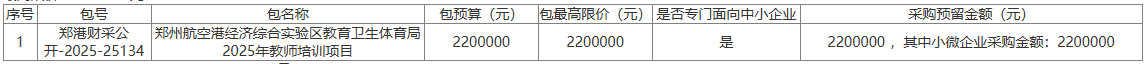 立方招采通显示,4月11日,郑州航空港经济综合实验区教育卫生体育局2025年教师培训项目进行公开招标,预算金额220万元,投标截止时间2025年5月8日9时。