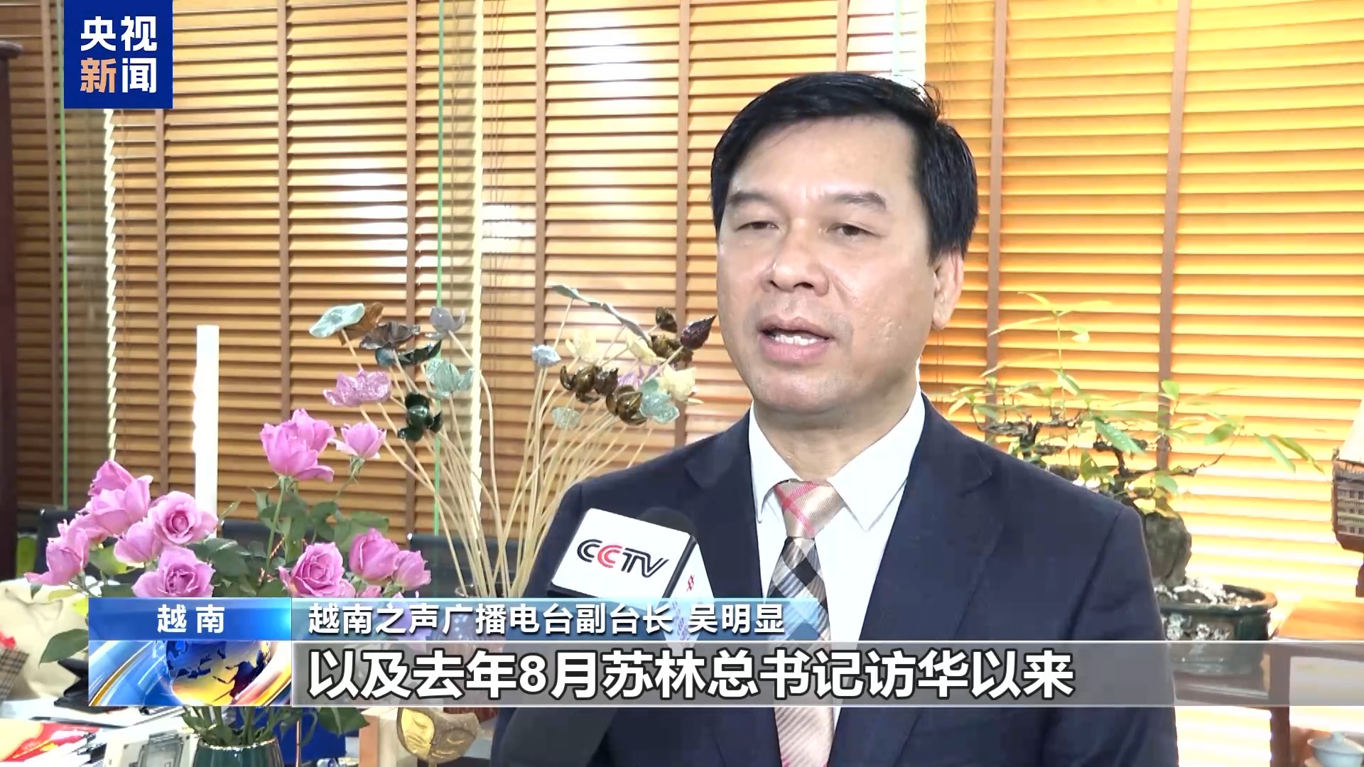 越南之声广播电台副台长 吴明显:我们报道了越中两国近年来取得的合作成果,特别是习近平总书记2023年访问越南,以及去年8月苏林总书记访华以来两国领导人推动越中关系,朝着两国人民所期待的方向迈进。相信习总书记此访将使两国多领域合作得到更有效、更实质性的推动。今年两国庆祝建交75周年,我在此祝愿两国人民拥有更加美好的未来。