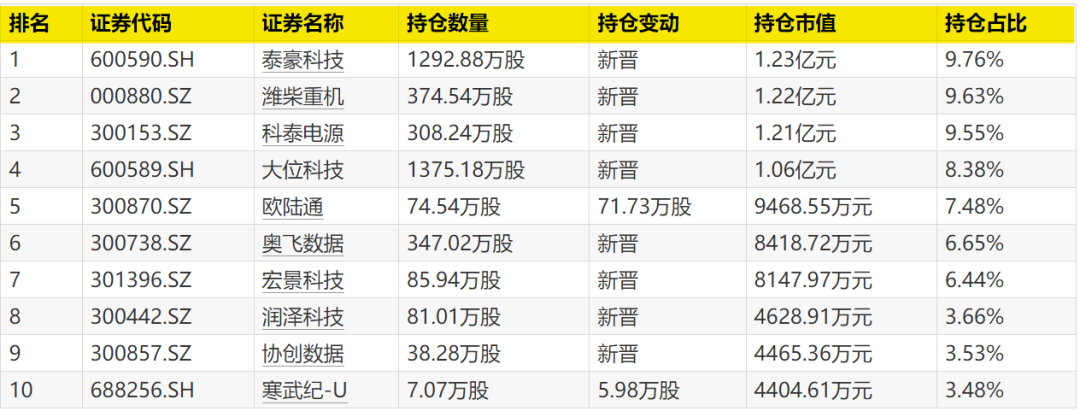 根据一季报,永赢数字经济智选在今年一季度新晋了泰豪科技、潍柴重机、科泰电源、大位科技、奥飞数据、宏景科技、润泽科技、协创数据8只个股,同时增持欧陆通、寒武纪-U。