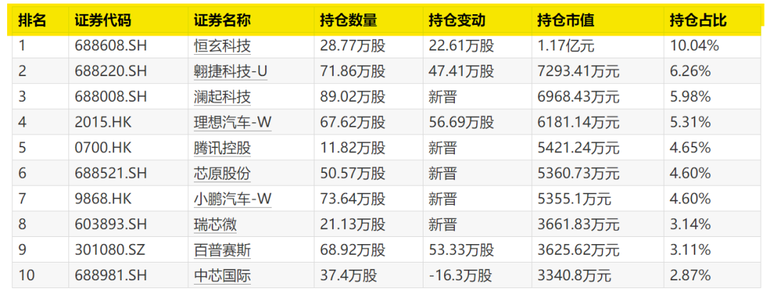 根据一季报,中欧智能制造在今年一季度新晋了澜起科技、腾讯控股、小鹏汽车-W、瑞芯微、芯原股份5只个股,加仓恒玄科技、翱捷科技-U、理想汽车-W、百普赛斯,减仓中芯国际。