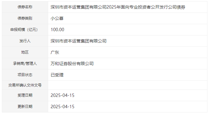 【大河财立方消息】4月15日,深圳市资本运营集团有限公司2025年面向专业投资者公开发行公司债券项目获深交所受理。
