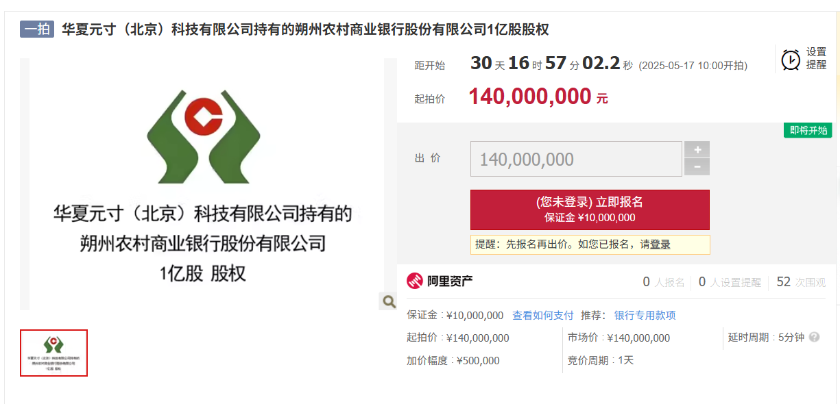 【大河财立方消息】4月16日,阿里司法拍卖平台显示,朔州农村商业银行股份有限公司1亿股股权将于5月17日开拍,起拍价1.4亿元,加价幅度为50万元及其倍数。以该行注册资本计算,该笔股权占比约6.67%。截至记者发稿,本次拍卖暂未有人报名。
