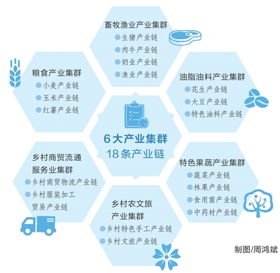 《方案》明确重点,2025年至2027年,河南省将聚焦粮食、畜牧渔业、油脂油料等6大产业集群,因地制宜培育18条乡村富民产业链,让土特产成为兴业强县富民的金疙瘩。