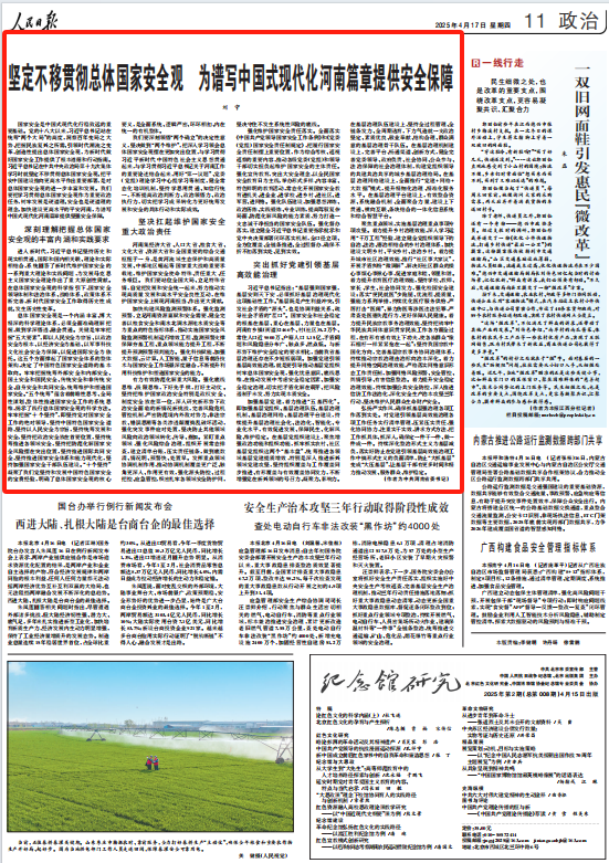 4月17日出版的《人民日报》,刊发河南省委书记刘宁署名文章:《坚定不移贯彻总体国家安全观 为谱写中国式现代化河南篇章提供安全保障》。