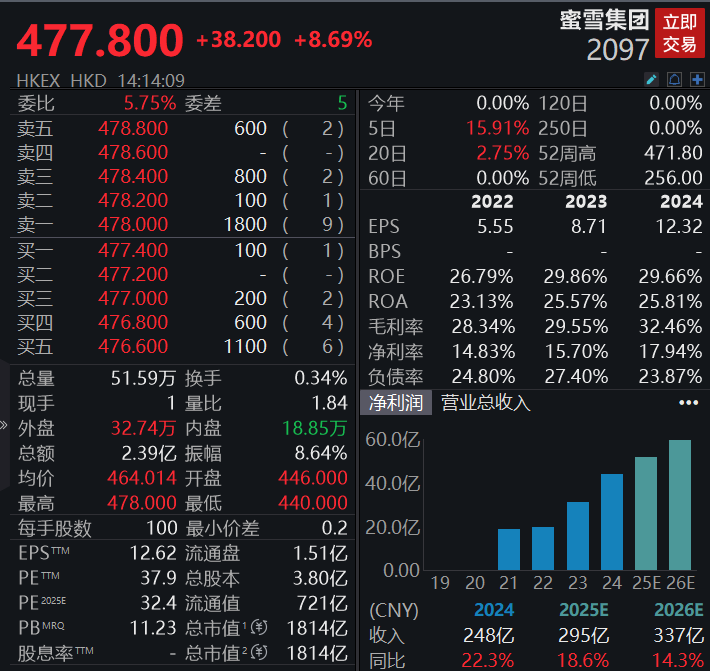 【大河财立方消息】4月17日,港股公司蜜雪集团盘中股价再创新高。截至14时12分,蜜雪集团股价涨8.69%,报477.80港元/股,市值达1814亿港元。