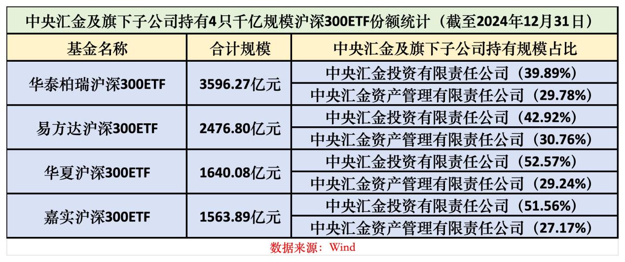 此前,中央汇金已经是沪深300ETF产品的持仓大户。大河财立方记者整理发现,2024年年报显示,截至2024年12月31日,在4只规模突破千亿元的沪深300ETF中,中央汇金及旗下子公司分别持有69.97%、73.68%、81.81%、78.73%的份额,是几只基金的最大持有人。