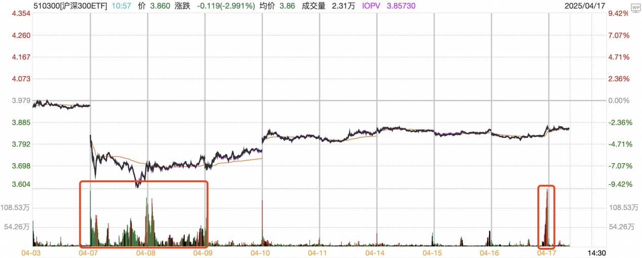 以市场规模最大的华泰柏瑞沪深300ETF为例,在4月7日至4月16日的成交图中,4月7日、8日、16日均出现了大额交易,也对应着“国家队”的护盘操作。