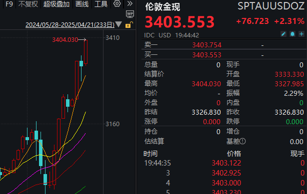 截至发稿,现货黄金(伦敦金现)涨幅扩大至2.31%,报3403.553美元/盎司,站上3400美元/盎司关口,为历史上首次。