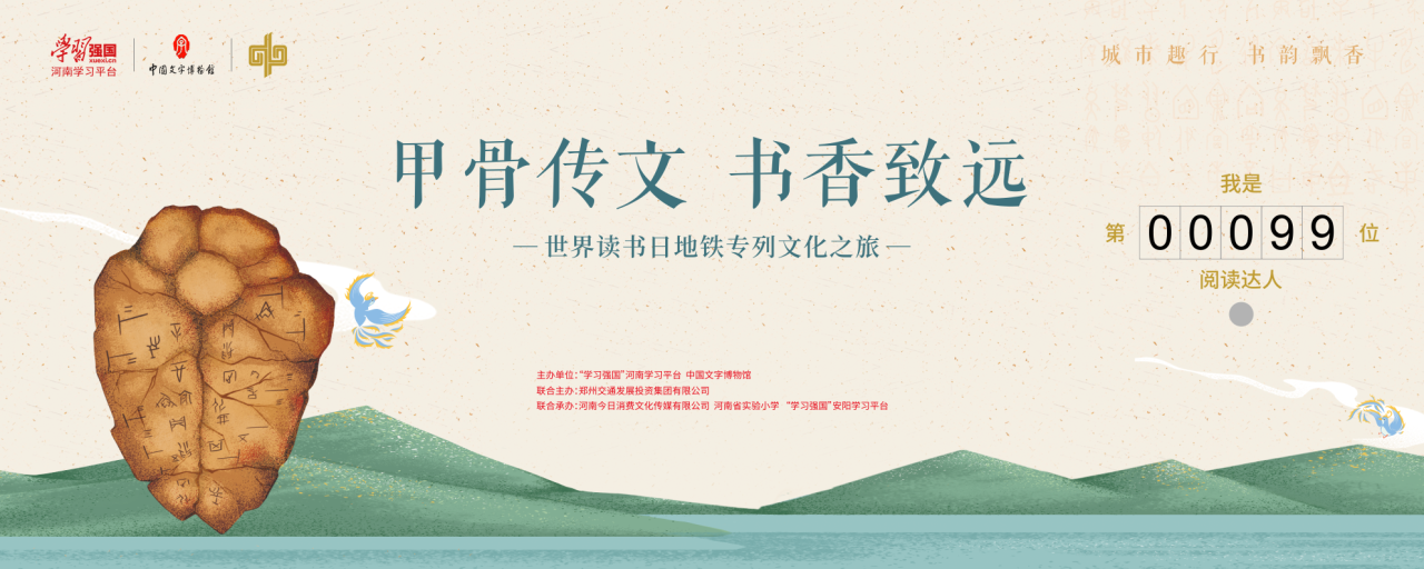 书香满城,悦读同行。2025年世界读书日到来之际,河南日报社、“学习强国”河南学习平台、中国文字博物馆等单位将联合发起“甲骨传文 书香致远”系列活动,以甲骨文为核心元素,以中国文字博物馆“学习强国”文博基地为依托,通过图书漂流、主题快闪、盲盒书屋、甲骨传文等形式,通过线上线下联动,让甲骨文“活”起来,让阅读融入城市生活。
