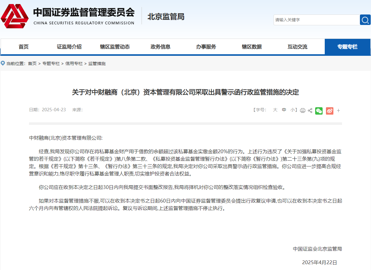 【大河财立方消息】4月23日消息,北京证监局公告,对中财融商(北京)资本管理有限公司采取出具警示函行政监管措施。
