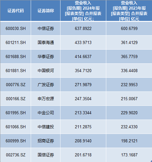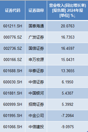 Wind数据显示,2023年营收排名前十位的上市券商,2024年年报已悉数披露。