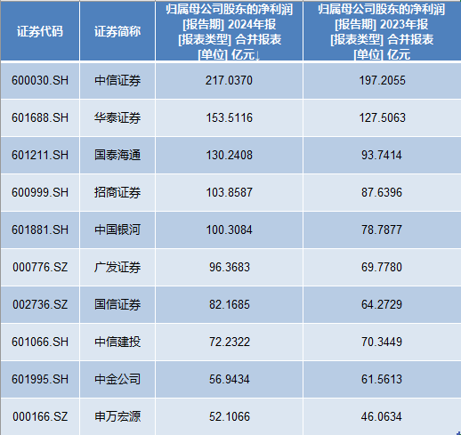 其中,中信证券2024年的净利润超过200亿元,以217.04亿元的盈利水平排名第一。