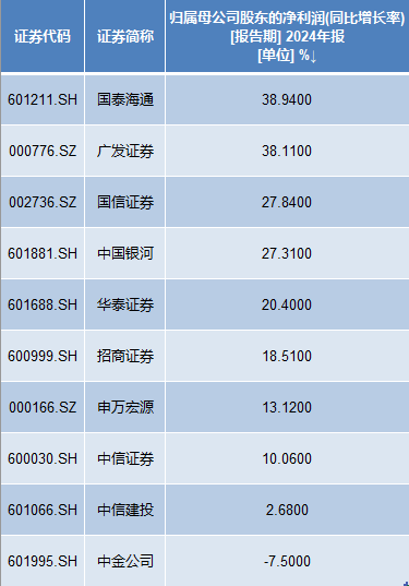 净利润增幅方面,2024年10家头部券商中,有9家券商的净利润同比实现正增长。