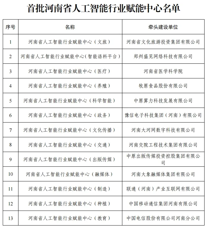 记者梳理发现,此次入选的13个河南省人工智能行业赋能中心,主要涵盖医疗、教育、种植、养殖、政务、交通、制造、文旅、文化传媒等行业人工智能应用,以及智能语料平台、科学智能等支撑性领域。