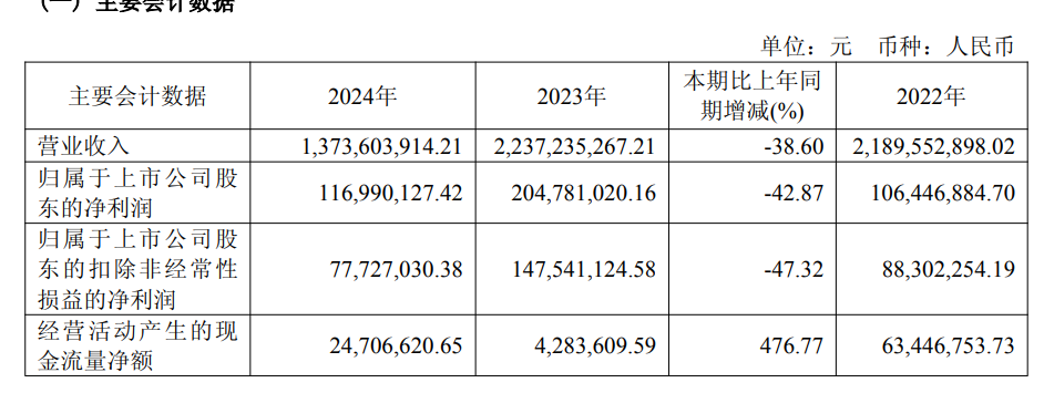 同日,洪田股份披露2024年年度报告。报告期内,公司实现营业收入13.74亿元,同比下降38.6%;实现归属于上市公司股东的净利润为1.17亿元,同比下降42.87%。