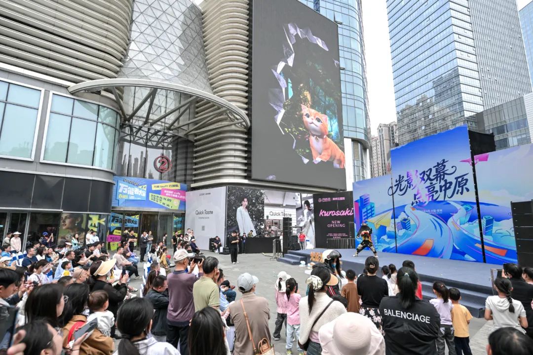 当天,中原首个户外双幕裸眼3D大屏——“光影双幕”正式点亮。一只追逐蝴蝶的灵动小猫从屏幕中跳出,与路人奇妙互动,点燃现场氛围,引得围观市民纷纷拿出手机拍照打卡。活动现场,海底捞、锅圈、失眠企鹅等数十家品牌商“扎堆”设置展位,观众穿梭打卡,沉浸其中。大幕之上,华为、小米、携程、元气森林、红旗、麦当劳、杜康、仁怀酒、花花牛等品牌视频轮番播放,讲述品牌故事与魅力。