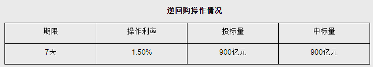 【大河财立方消息】4月27日消息,中国央行今日开展900亿元7天期逆回购操作,投标量900亿元,中标量900亿元,操作利率为1.50%,与此前持平。因今日无逆回购到期,当日实现净投放900亿元。
