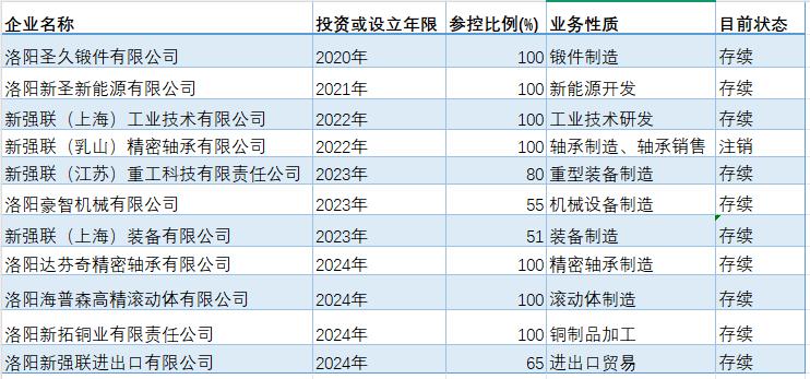 2021年,新强联以1.76亿元的价格收购豪智机械55%股权;2023年,又以9.72亿元价格收购圣久锻件51.15%股权,使其成为其全资子公司。2024年上半年,新强联又设立洛阳海普森高精滚动体有限公司、洛阳达芬奇精密轴承有限公司、洛阳新拓铜业有限责任公司等多家公司。