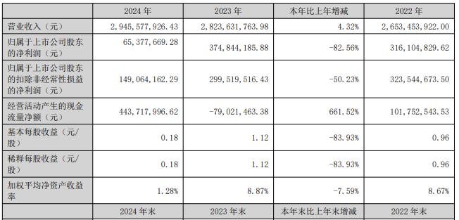 根据新强联2024年年报,报告期内,公司实现营业收入29.46亿元,同比增长4.32%;实现净利润6537.8万元,同比大幅下降82.56%;实现扣非后净利润1.49亿元,同比下降50.23%。