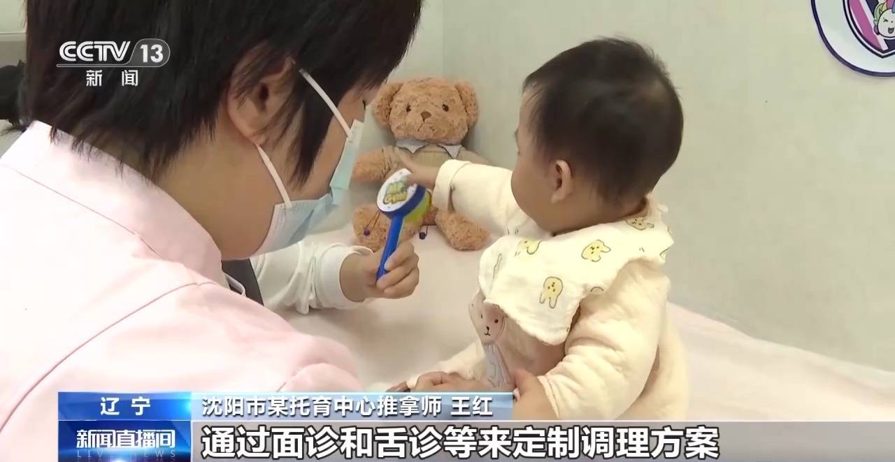沈阳市某托育中心推拿师 王红:我们将望闻问切纳入到日常照护,每个入托宝宝我们都会建立,婴幼儿健康指标测查档案,通过面诊和舌诊等来定制调理方案,我们还会教家长一些简单的推拿手法,让中医护从机构延伸到家庭。