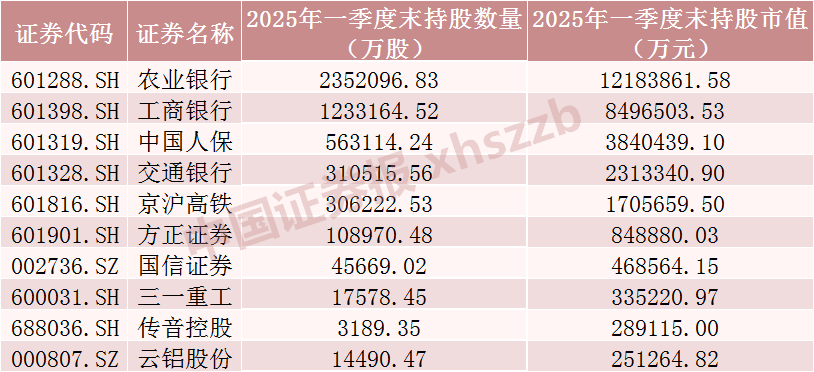 从社保基金持股数量看,截至一季度末,社保基金持股数量排名前三的个股分别为农业银行、工商银行、中国人保,持股数量分别为235.21亿股、123.32亿股、56.31亿股。