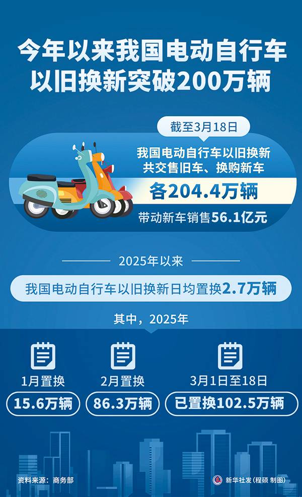 今年中央财政拿出“真金白银”,推出促消费政策“大礼包”。安排超长期特别国债资金3000亿元支持消费品以旧换新,资金规模比去年翻了一番。截至2025年3月18日,我国电动自行车以旧换新共交售旧车、换购新车各204.4万辆,带动新车销售56.1亿元。 新华社发 程硕/制图