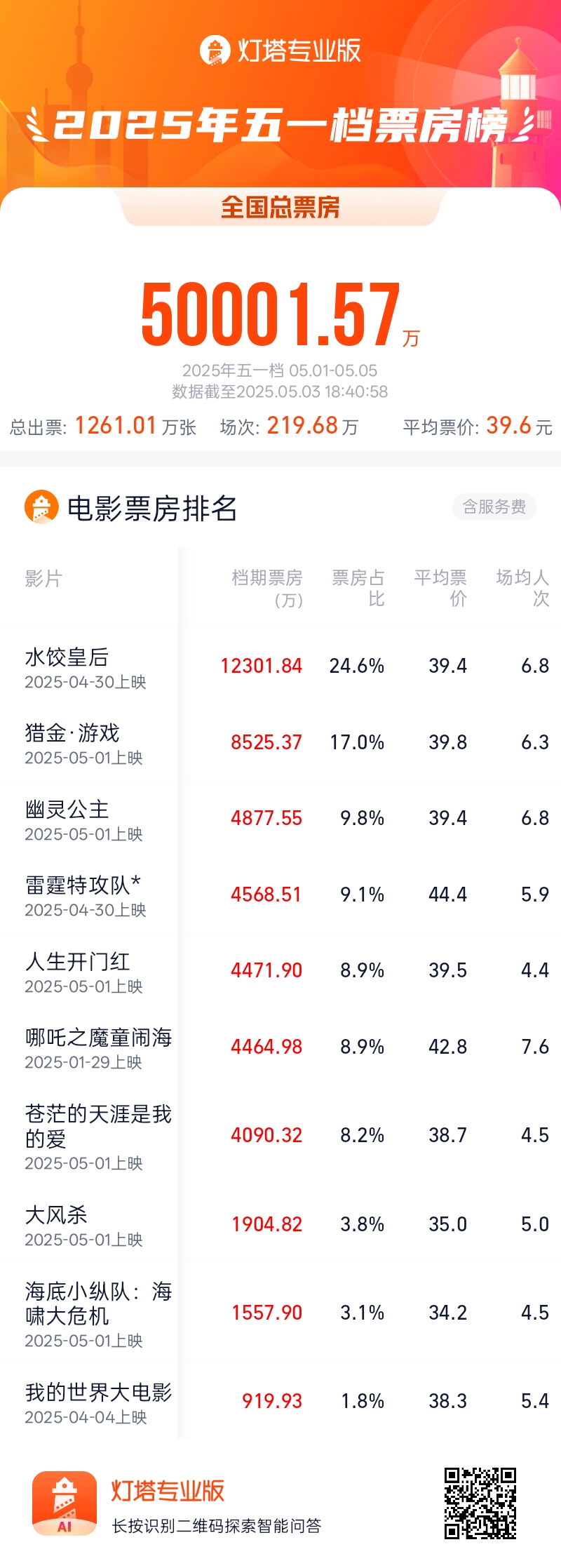 【大河财立方 记者 徐姣】据灯塔专业版,截至5月3日18时40分,2025年五一档(5月1日—5月5日)档期内总票房(含预售)突破5亿元。影片《水饺皇后》以1.23亿元票房暂列档期首位;《猎金·游戏》《幽灵公主》居第二、第三位。