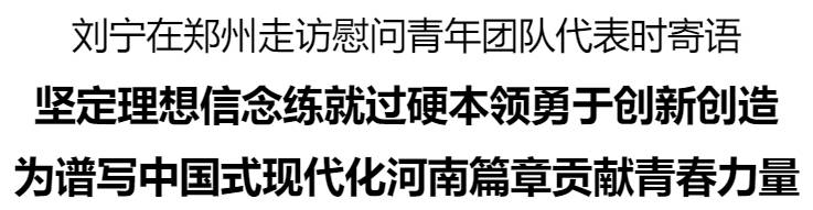 五四青年节当天,省委书记刘宁在郑州市走访慰问青年团队代表,代表省委、省政府向全省广大青年和青年工作者致以节日问候,希望大家深入学习贯彻习近平总书记关于青年工作的重要思想,坚定不移听党话、跟党走,挺膺担当、砥砺奋进,不负青春、无愧时代,为谱写中国式现代化河南篇章贡献青春力量。