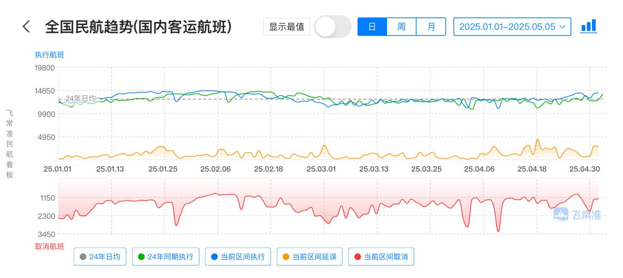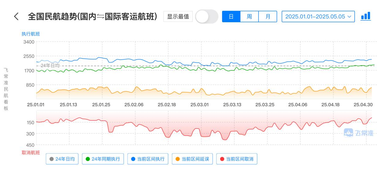 这与节前预测的趋势相符。“五一”假期前,中国民航局举行例行新闻发布会。会上,民航局相关负责人介绍,“五一”假期民航运输市场将保持平稳增长态势,预计旅客运输量1075万人次,日均215万人次,同比2024年增长8%,创同期历史新高。