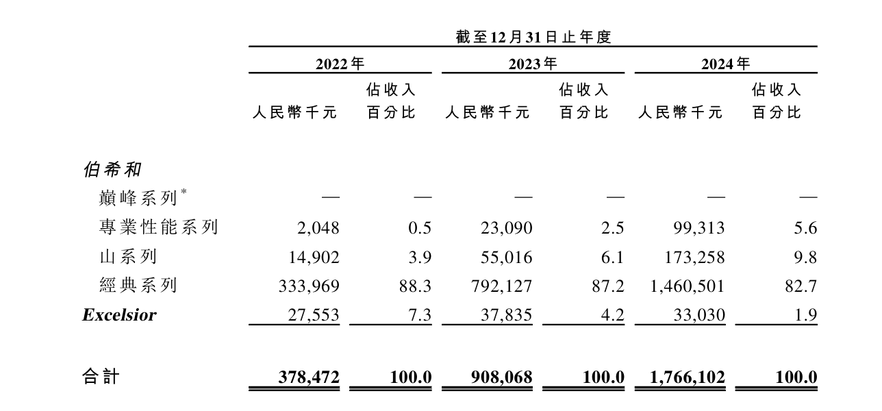 其中,价格相对亲民的经典系列是伯希和的收入核心,也是其获得“始祖鸟平替”称谓的原因。招股书显示,2024年,专业性能系列、山系列和经典系列分别实现收入9931万元、1.73亿元、14.61亿元,分别占总收入的5.6%、9.8%和82.7%。由于巅峰系列于2025年1月刚刚推出,因此并未计入销售收入。