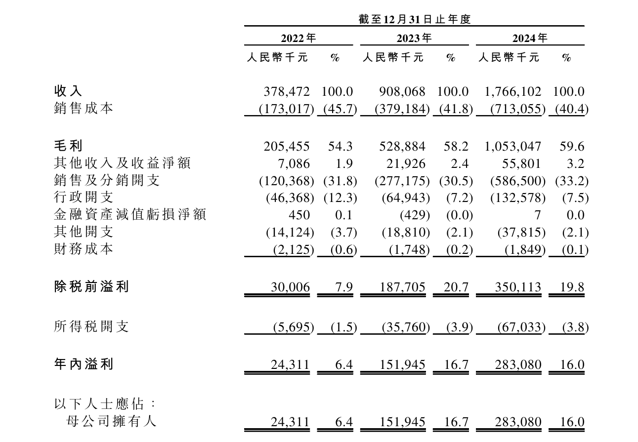 招股书显示,伯希和为2024年中国内地同行业顶尖企业中增长最快的高性能户外服饰品牌。根据弗若斯特沙利文的资料,伯希和的净销售额由2022年的3.51亿元增加至2024年的17.33亿元,复合年增长率(CAGR)为122.2%;按2024年零售额计算,伯希和已跻身中国内地三大本土高性能户外服饰品牌,占同年市场份额的5.2%。