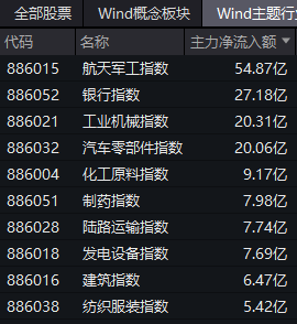 资金流向上,以Wind主题行业分类,早盘主力净流入航天军工、银行、工业机械、汽车零部件等板块,其中,主力净流入航天军工板块54.87亿元;主力净流出软件、券商、电子元器件、半导体等板块。